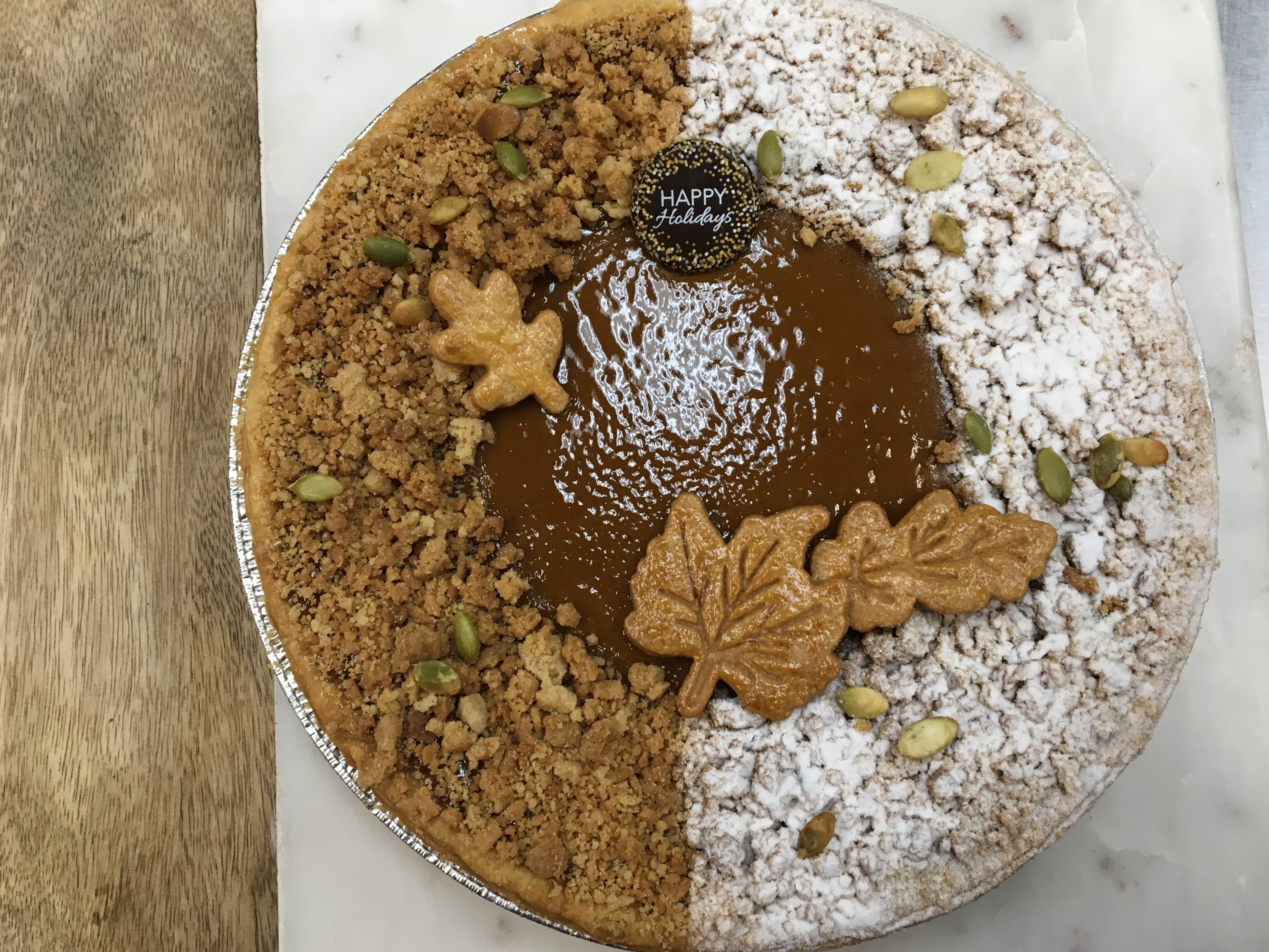 Lightly spiced pumpkin custard baked in a flaky pie shell, topped with cinnamon crumbles and toasted pumpkin seeds.
